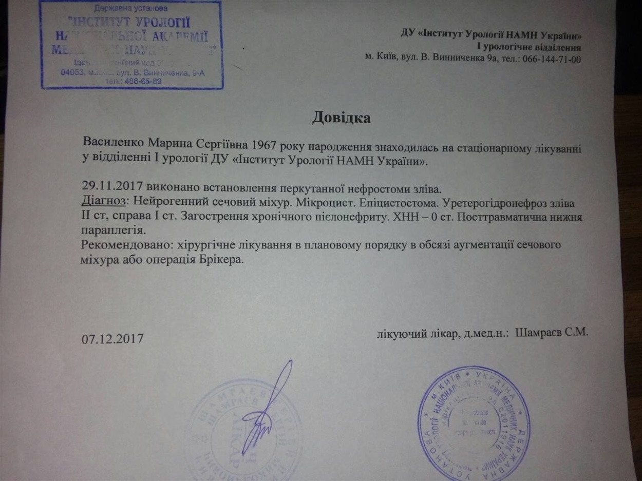 У нее проблемы с мочевыделительной системой, устранить которые можно только путем хирургического вмешательства - аугментационной цистопластики или операции Брикера. Стоимость лечения - около 80 тысяч гривен. Таких средств у женщины нет, а собрать их нужно до 28 февраля.
