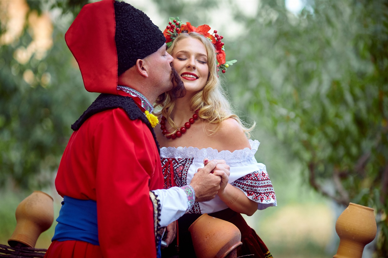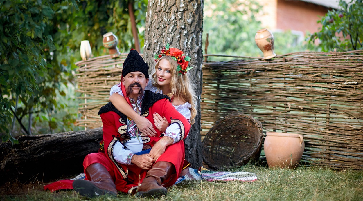 - В Мелитополе. А до того у нас была замечательная фотосессия «лав стори» на импровизированном казацком подворье. Я искала идею для снимков и подумала, что Гарри похож... на казака. В костюмерной театра мы арендовали национальные костюмы ручной работы, и я превратилась в «юну дівчину», а мой супруг был такой статный казак. Самое интересное, что накладные усы мы ему взяли, а про оселедец – забыли! Фотографом был Юра Рыженко.