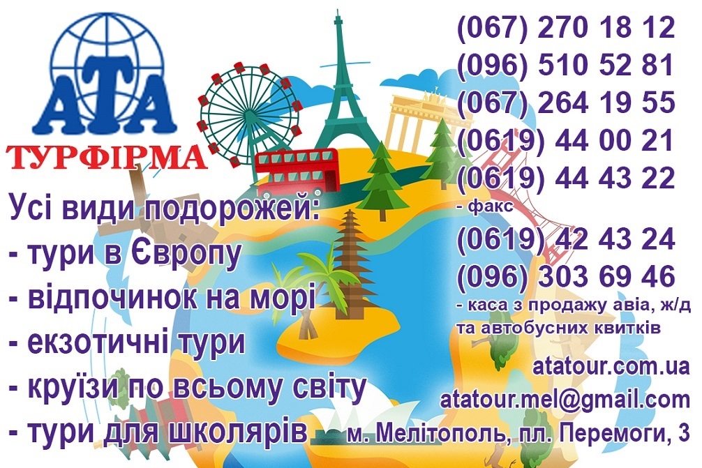 Турфірма «А-ТА» знаходиться за адресою: м. Мелітополь, пл. Перемоги, 3, конт. тел.: (0619) 44-00-21, (0619) 44-43-22, ( 067) 270-18-12. Професійні менеджери підберуть для вас оптимальний і цікавий тур.